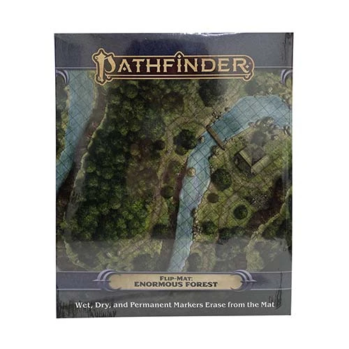 The biggest Flip-Mats in history just got bigger! Introducing Enormous Forest, a brand-new amazingly giant Flip-Mat bigger than any Paizo has produced before! Measuring a titanic 30″ by 46″ when unfolded, this exciting new map presents a sprawling section of forest on each side – one side dense and primeval, and the other cut through with a shaded road just perfect for ambushing player characters. Spread this woodland across your tabletop and watch your players’ eyes pop out at the enormity of it all! Your player character’s biggest problems just got even bigger!
