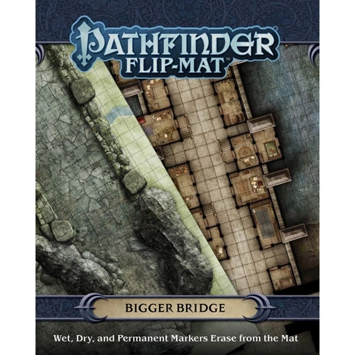Whether players are traversing a giant’s byway on a high mountain pass or braving the bustle of a cosmopolitan span, the possibilities for adventure are endless with Pathfinder Flip-Mat: Bigger Bridge. With an area that’s 45% larger than normal Pathfinder Flip-Mats at their disposal, Game Masters can now dream even bigger! This massive gaming accessory presents a wide causeway over a perilous mountain drop and a city bridge complete with shops and workshops teetering on its edges.