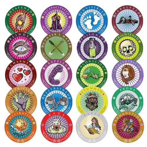 Condition chips are designed to solve the perennial problem of players struggling to remember the specific rules around the various maladies that can be afflicted upon them or that they can inflict on the poor unwitting monsters in the 5th edition of the world’s most popular roleplaying game!