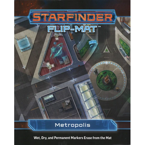 This double-sided Flip-Mat features the skyscrapers and streets of a modern city center on one side and a wide-open traffic circle around a modern sculpture garden perfect for vehicle or mech combat on the other. Flip-Mats present ready-to-use science-fantasy set pieces for the busy Game Master. With Flip-Mat: Metropolis, you’ll be ready for the next time your players hit the town!