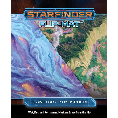 Whether the heroes are landing their starship to explore a newly discovered world or dogfighting in the skies in individual starfighters, this Flip-Mat has you covered. Featuring a hex grid for Starfinder‘s unique starship combat system, this extra-large, double-sided map comes with two different backgrounds – the thick clouds of a gas giant and a high-altitude view of a terrestrial world’s topography – to let you craft epic atmospheric starship battles and fire your players’ imaginations. Don’t waste time sketching when you could be playing. With Starfinder Flip-Mat: Planetary Atmosphere, you’ll be ready the next time your players take their starship planetside!
