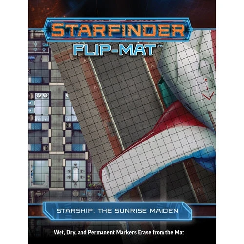 Whether the heroes are hopping between neighboring planets or exploring distant worlds on the frontiers of the galaxy, no Game Master wants to spend time drawing every cabin and companionway on a starship. Fortunately, with this double-sided, oversized Starfinder Flip-Mat, you don’t have to! This Flip-Mat features two ready-to-use science-fantasy scenes, designed specifically for use with Starfinder’s Dead Suns Adventure Path but suitable for play with any space-based adventure. The detailed interior of the Sunrise Maiden starship is depicted on one side while the exterior of the ship inside a docking bay is shown on the other.