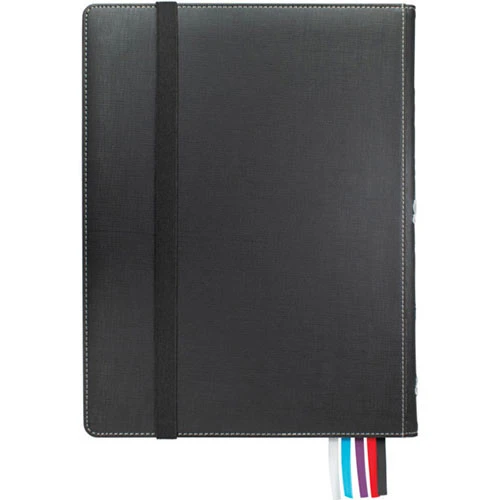 The textured leatherette cover features a rigid layer of protection for both the front and back of the book, while remaining flexible at the binding for ease of use. Simply slip the back cover into the back inner pocket and use the front elastic strap to either hold the front cover open, or secure the book closed by pulling it over the back cover. Easily reference important pages marked by 5 attached and color-coded ribbons (black, red, blue, purple, & white).