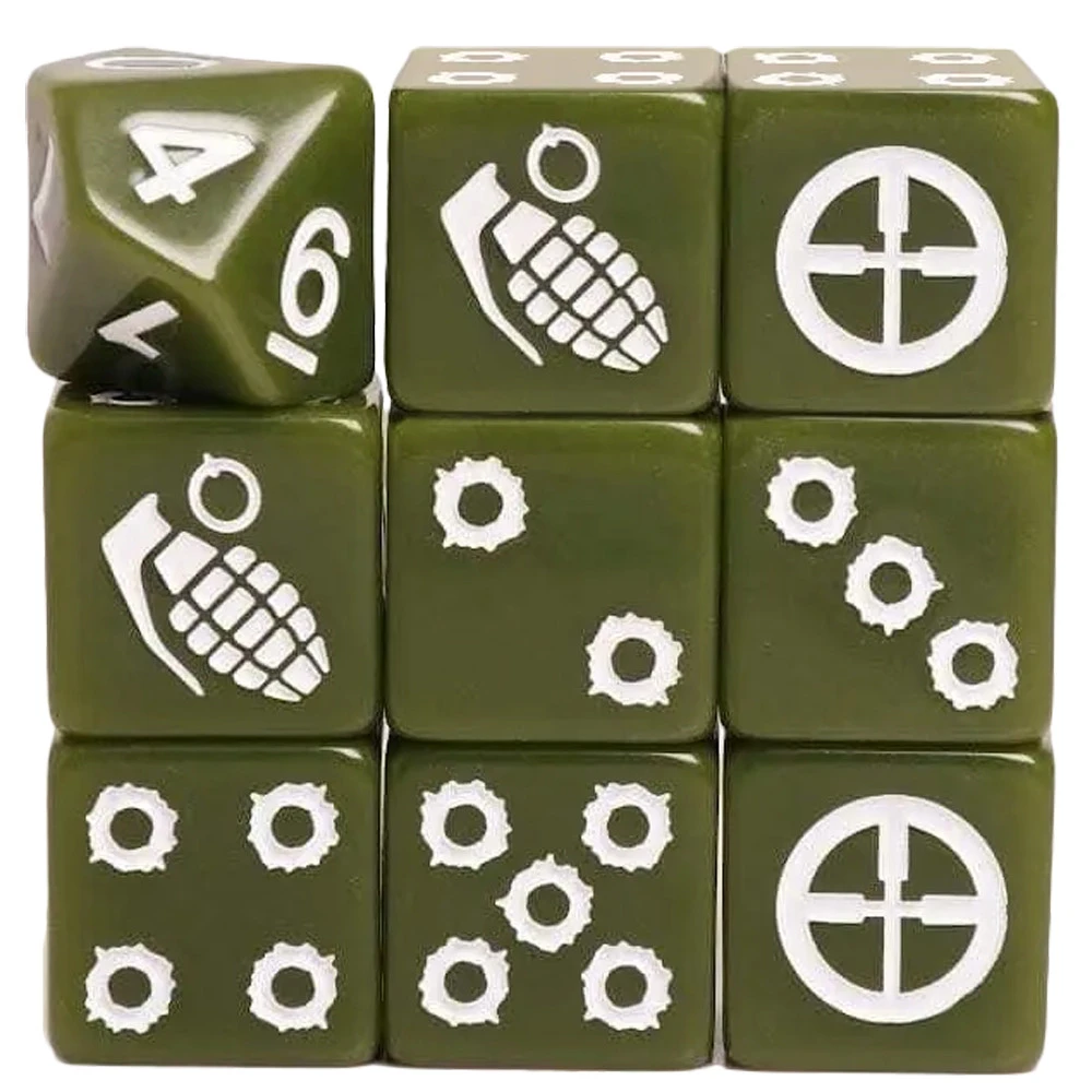 A set of 9 Dice (8 D6 and 1 D10) designed specifically for the War Stories World War 2 RPG. These special dice are designed to support the game mechanics but can be used as normal six-sided and ten-sided dice as well.